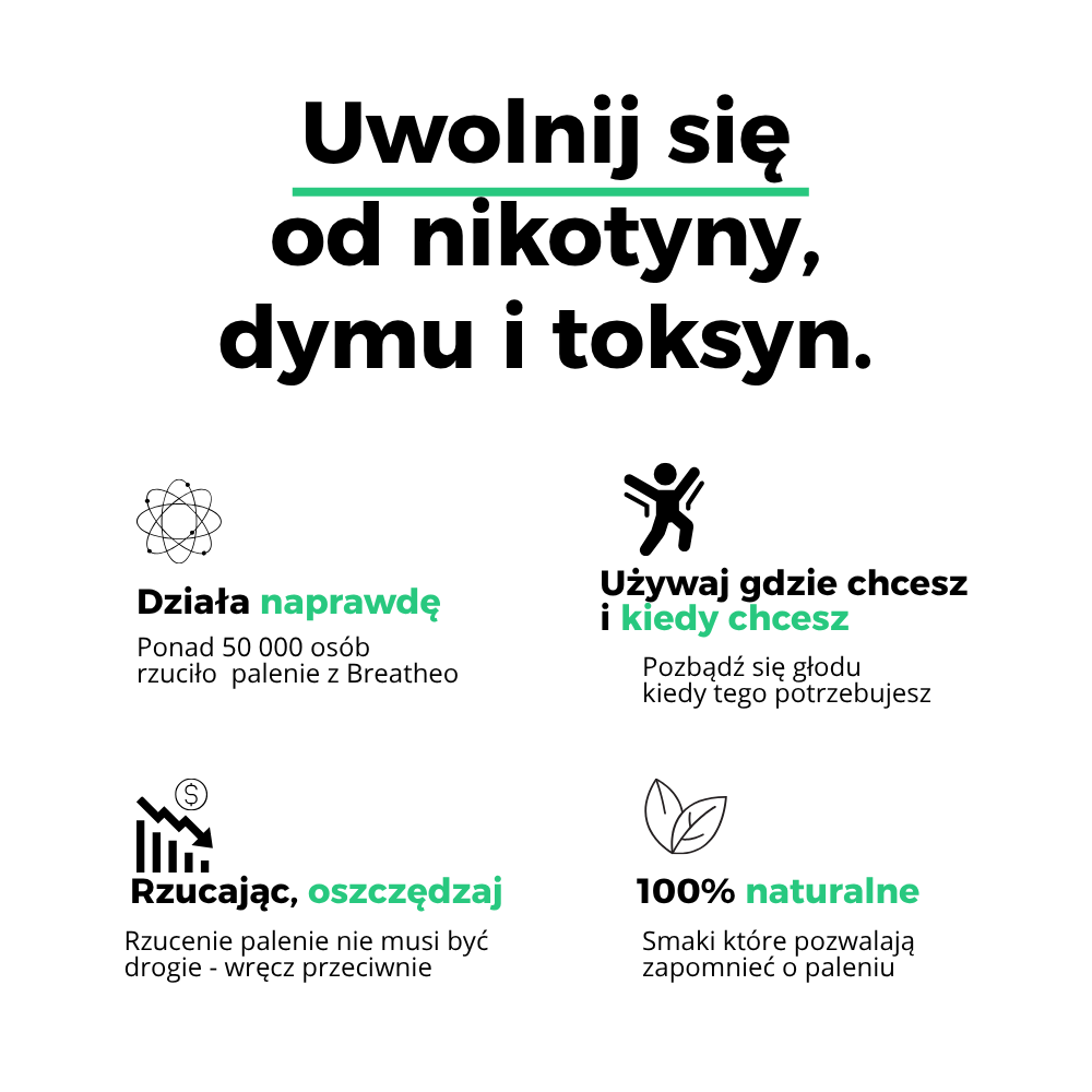 Zdecydowanie tak! Breatheo powstaje w 100% z naturalnych składników, w tym olejków eterycznych, ekstraktów roślinnych i naturalnych aromatów. Nie zawiera nikotyny, chemikaliów ani szkodliwych toksyn, co czyni go bezpieczną i czystą alternatywą dla palenia i wapowania.
